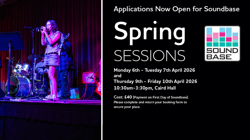 The Soundbase Spring Sessions offer young people aged 12-18 yrs the opportunity to work with a team of professional musicians and learn new skills. This 4-day music workshops will give you the opportunity to improve guitar playing, drumming, keyboard, developing a band, song-writing and performance skills.