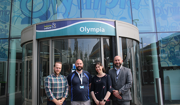 Image: Stuart Brown - Deputy Head of Prevention Services, Chest Heart Stroke Scotland (CHSS), Chris Baily - Health & Fitness Manager, Active Dundee, Jayne Brown, Business Relationship Manager, CHSS and Fraser Calderwood, Olympia Manager on a site visit to Olympia