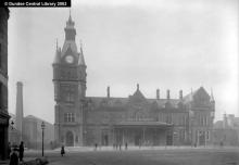 This photograph is taken looking west along Dock Street in Dundee, with the third Dundee West Station standing proudly on the west side of South Union Street, its elegant clock tower dominating the skyline.