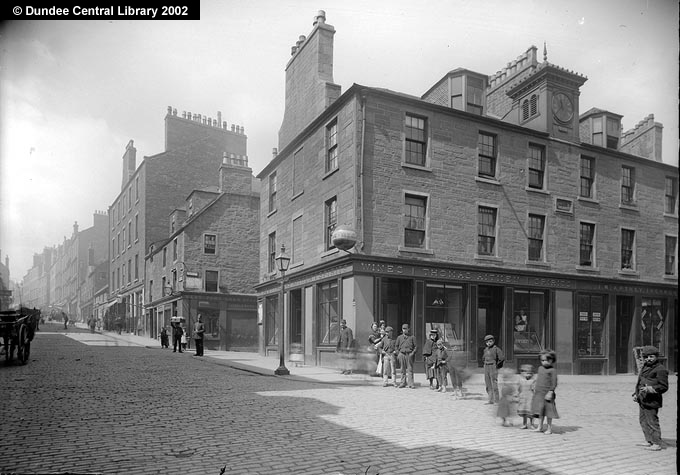 This view of the east end of the Hawkhill in Dundee shows part of the West Port, with Thomas Aitken's public house, The Globe, while No. 51 the ironmongery, listed in Dundee Directory as millfurnisher.