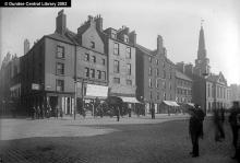 Castle Street leads southwards to the left of this photograph, which shows the southern side of Dundee High Street leading towards the Town House in the west.