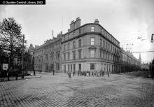 This photograph shows the corner of Dundee's Reform Street, running southwards towards the Town House to the right, and Meadowside to the east and left, with the trees in front of the Albert Institute.