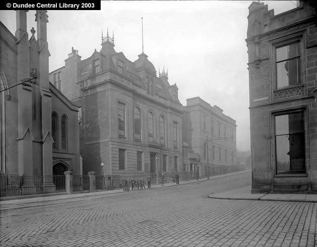 This photograph is taken from the south side of Euclid Crescent in Dundee, looking westwards into Constitution Road, with the Ward Chapel at the left, the Y.M.C.A. building centrally, (currently 2016, Volunteer Centre 10 Constitution Road) and a United Free Church to the right.